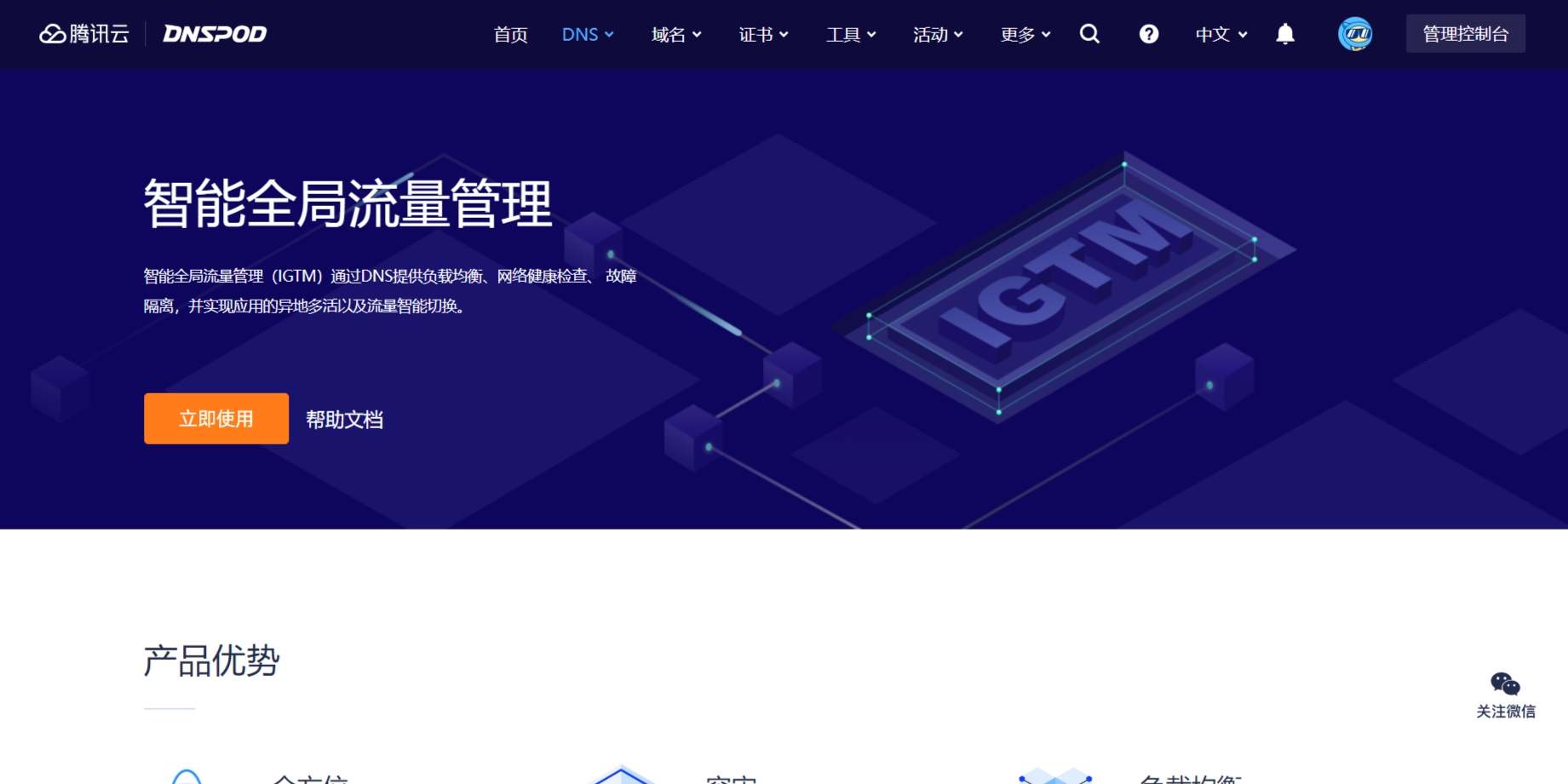 腾讯旗下经久不衰的DNS服务平台,提供监控、流量管理等功能